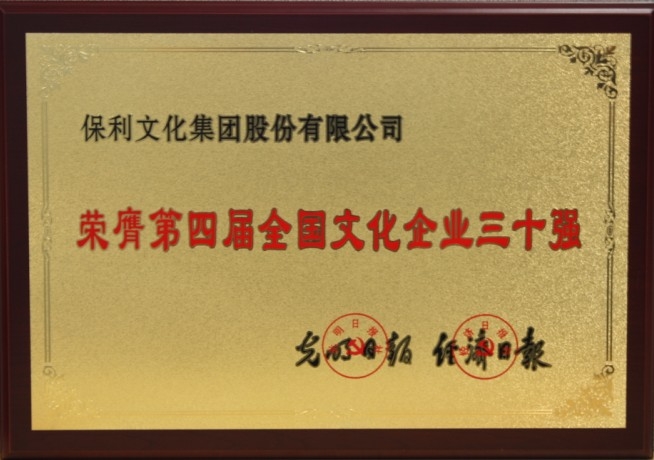 保利文化集團股份有限公司2004年被文化部命名為“文化產業示范基地”;2011年被文化部授予“十大最具影響力國家文化產業示范基地”稱號;2008年、2010年和2011年連續三屆入選“文化企業30強”。在第四屆的“文化企業30強”評選中,保利文化再度入選并蟬聯文化藝術類第一名,進一步確立了在中國文化企業第一陣營中的重要地位,提升了品牌美譽度和社會影響力,為實現跨越式發展打下了堅實的基礎。
