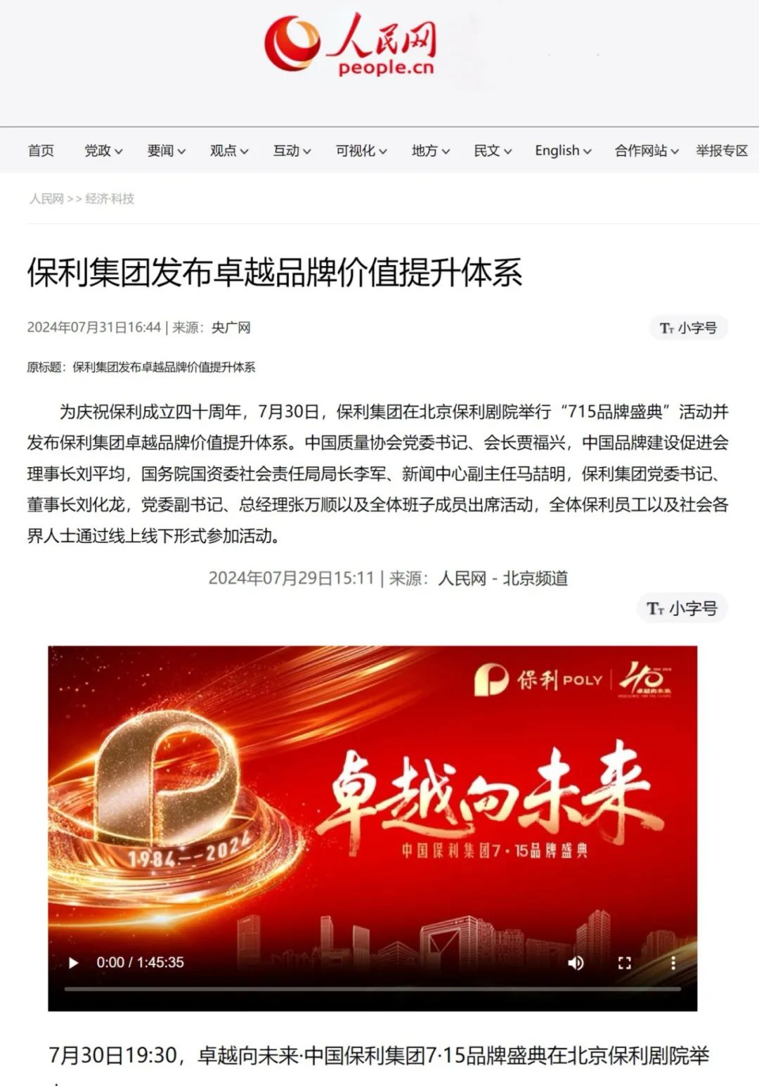 聚焦改革發展突出成就。《人民日報》頭版“高質量發展調研行”專欄刊發《穩健發展多元業務 擴大品牌影響 服務美好生活》一文,《國企》《國資報告》刊發集團署名文章,分別展現保利以卓著品牌建設助力高質量發展、堅定履行發展新質生產力使命等動態實效;此外,保利集團借勢重大節點策劃的卓越四十年高質量發展篇——深中通道通車專題報道,獲人民日報、新華社、央視、國資小新等廣泛報道,社會反響良好,進一步深化社會各界對“卓越保利”的認知度、認可度、美譽度。