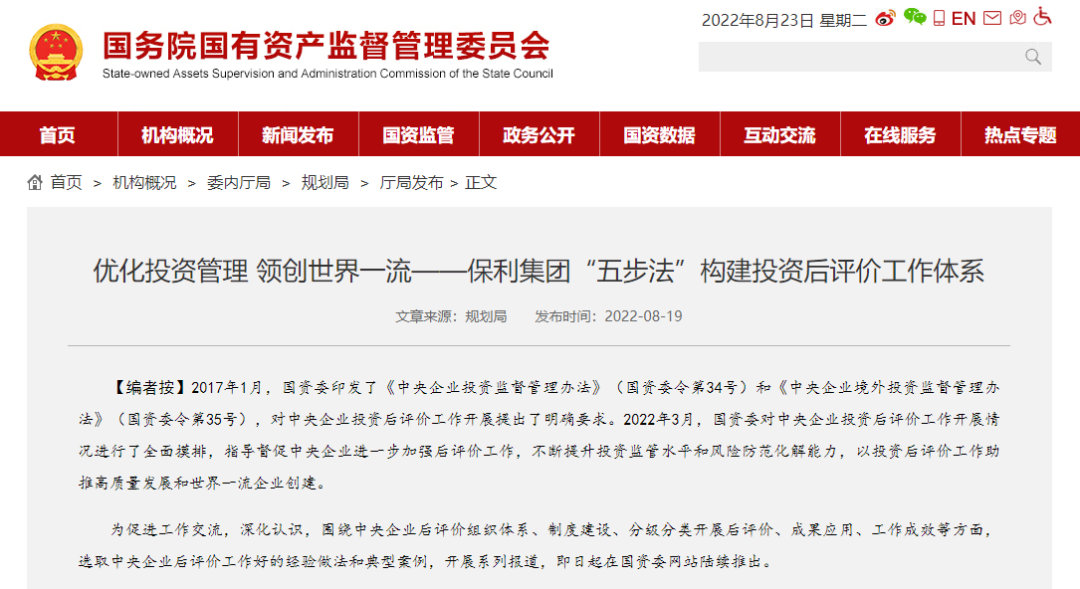 為促進工作交流,深化認識,國資委近期選取中央企業后評價工作好的經驗做法和典型案例,開展系列報道。8月19日,國資委官網首頁刊發該系列首篇文章——《優化投資管理 領創世界一流——保利集團“五步法”構建投資后評價工作體系》,詳細介紹了保利集團為進一步提升投資質量、優化投資布局、完善投資體系,構建的“五步法”后評價工作體系。