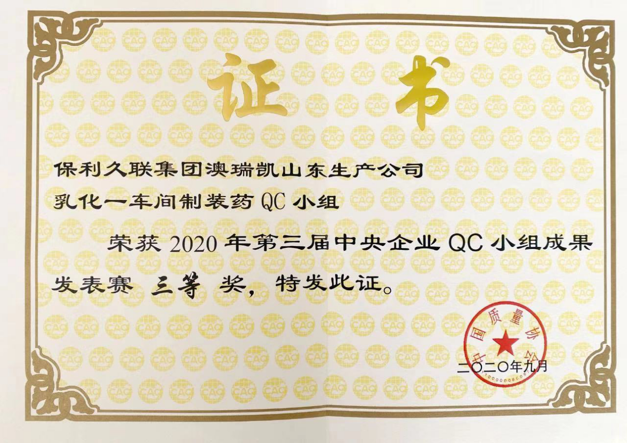 近日,由國務院國資委科創局指導、中國質量協會主辦的第三屆中央企業QC小組成果發表賽以在線方式成功舉辦。保利久聯集團澳瑞凱山東公司《運用QC方法降低JWL-III型膠狀乳化炸藥生產線廢品率》課題榮獲三等獎。