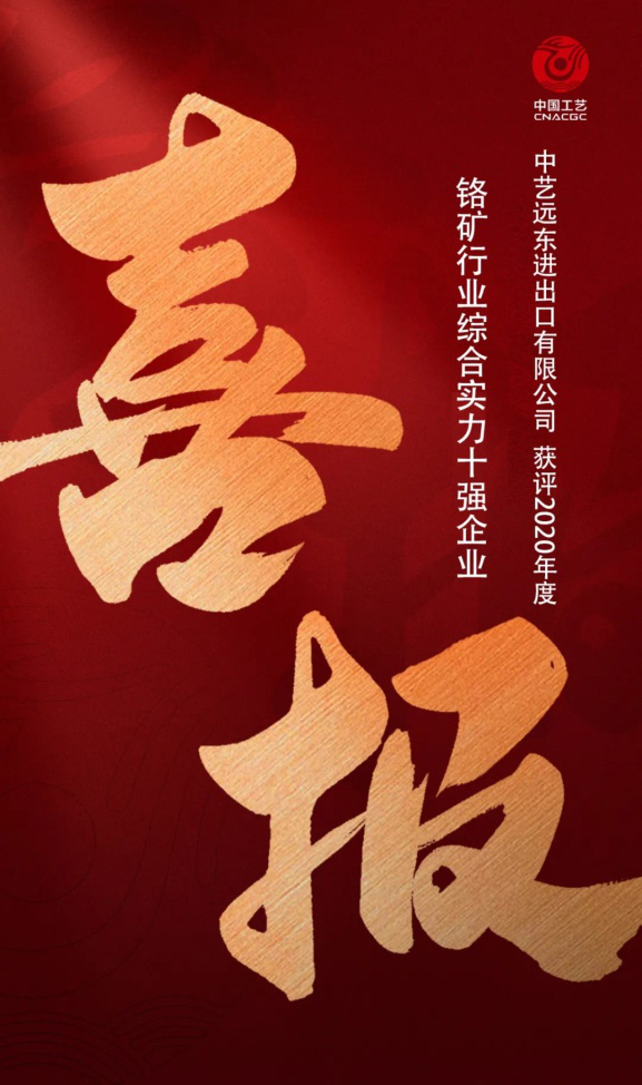 近日,在中國鐵合金行業專業門戶網站“鐵合金在線”開展的“2020年度中國鐵合金行業綜合實力十強企業”評選活動中,中國工藝集團旗下中藝遠東進出口有限公司被評選為“鉻礦行業2020年度綜合實力十強企業”。