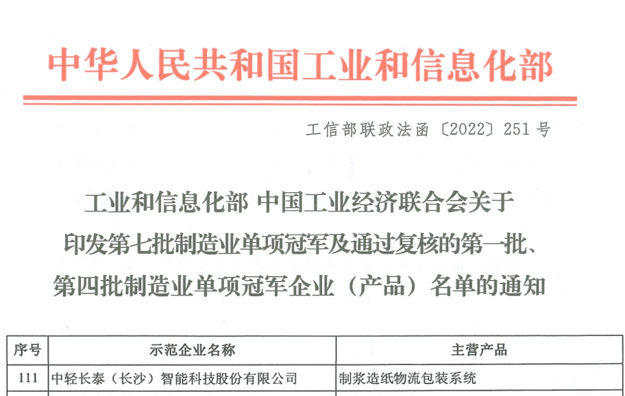 近期,保利中輕下屬中輕長泰(長沙)智能科技股份有限公司(簡稱“中輕長泰”)憑借國際領先的制漿造紙物流包裝系統產品被工業和信息化部等認定為制造業單項冠軍示范企業,體現出國家、行業對中輕長泰在制漿造紙行業智能制造實力的高度肯定。